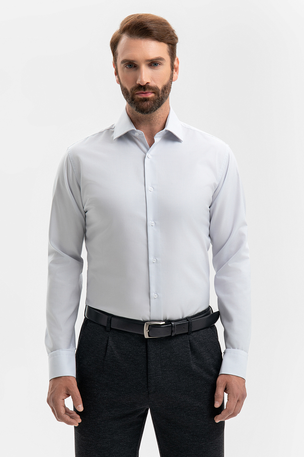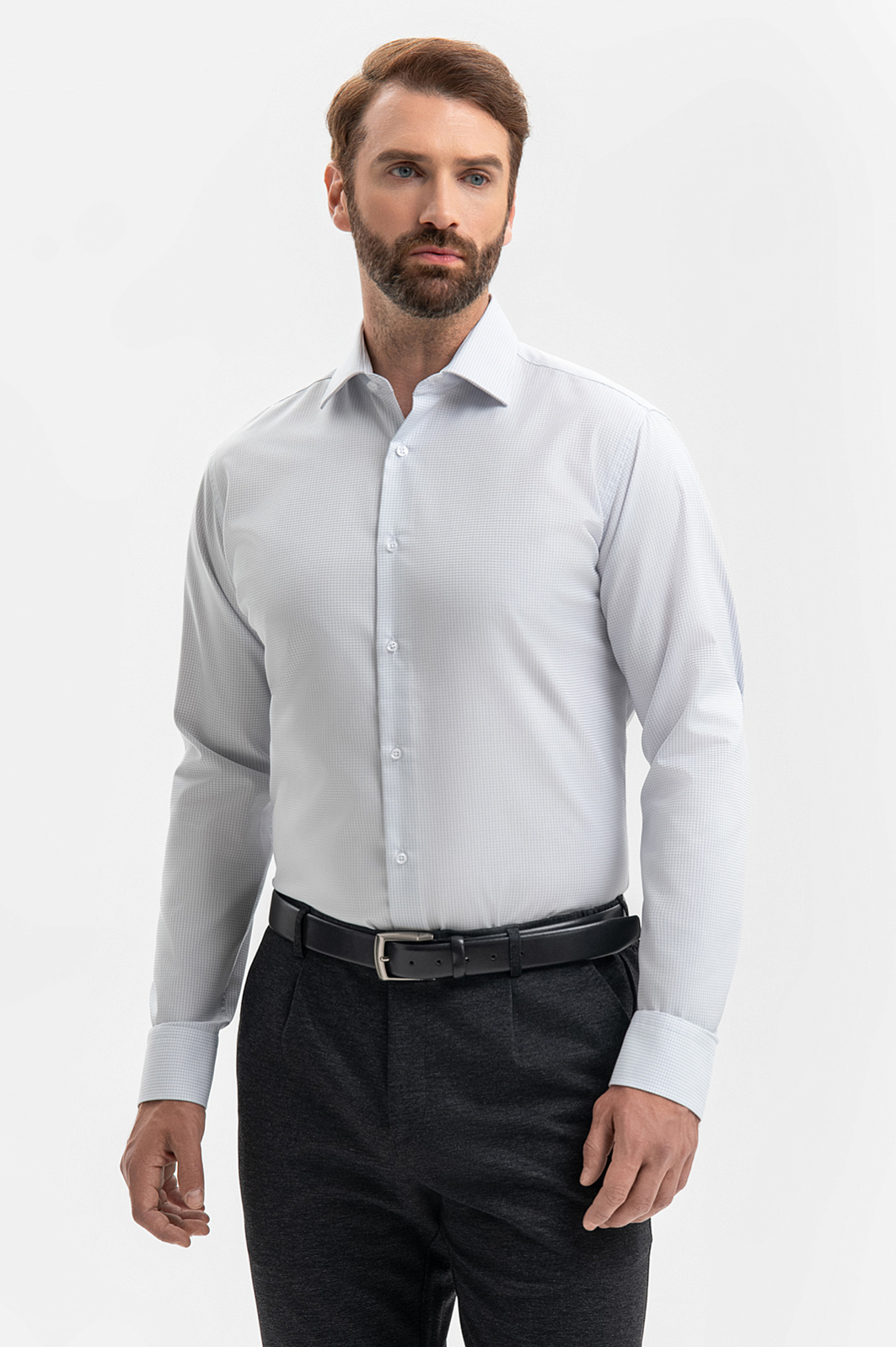 Белая сорочка KANZLER в тонкую мелкую светло-серую клетку — идеальная формула повседневного офисного стиля, слагаемые которой: сдержанность, индивидуальность и свежесть. Силуэт акцентирует внимание на мужественном развороте плеч и линии талии. Степень строгости образа можно варьировать, надевая с сорочкой классические или неформальные брюки. Сорочка сделана из чистого хлопка — гипоаллергенного легкого дышащего материала, который сохраняет свежесть надолго. Главное достоинство модели – материал со специальной обработкой, благодаря которой ткань долго сохраняет свою форму, практически не мнется, легка в уходе, а также не теряет цвет даже после множества стирок. Параметры модели: рост 189, 102-80-99 Размер на модели: 40