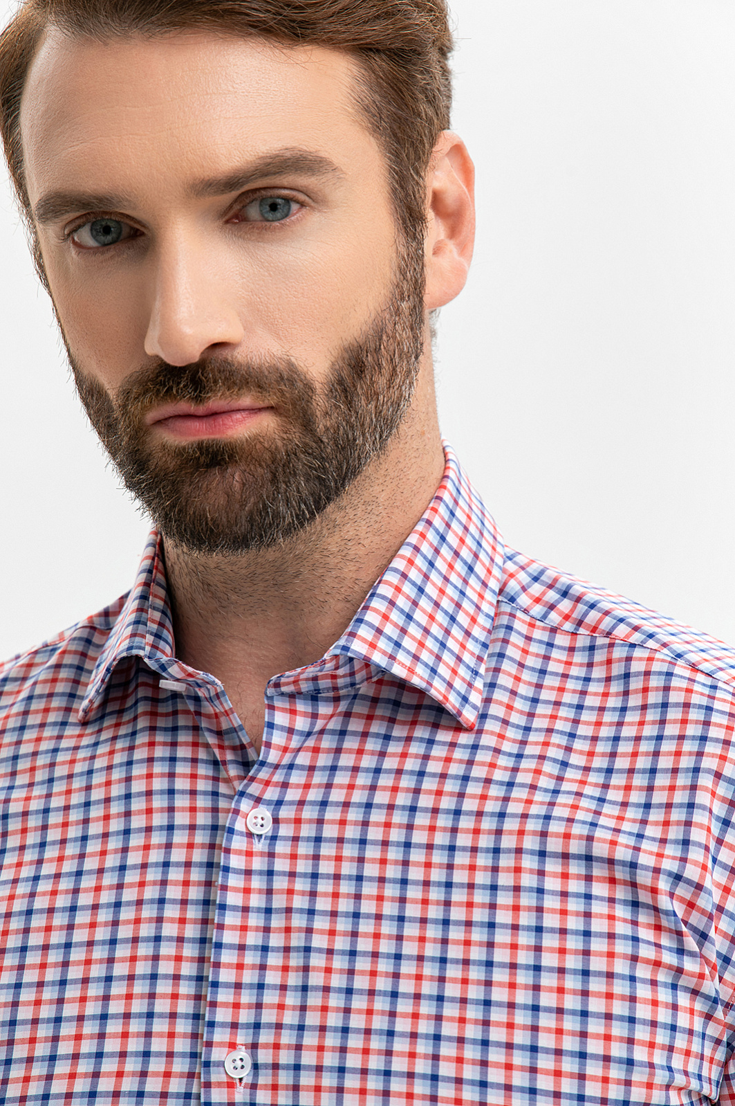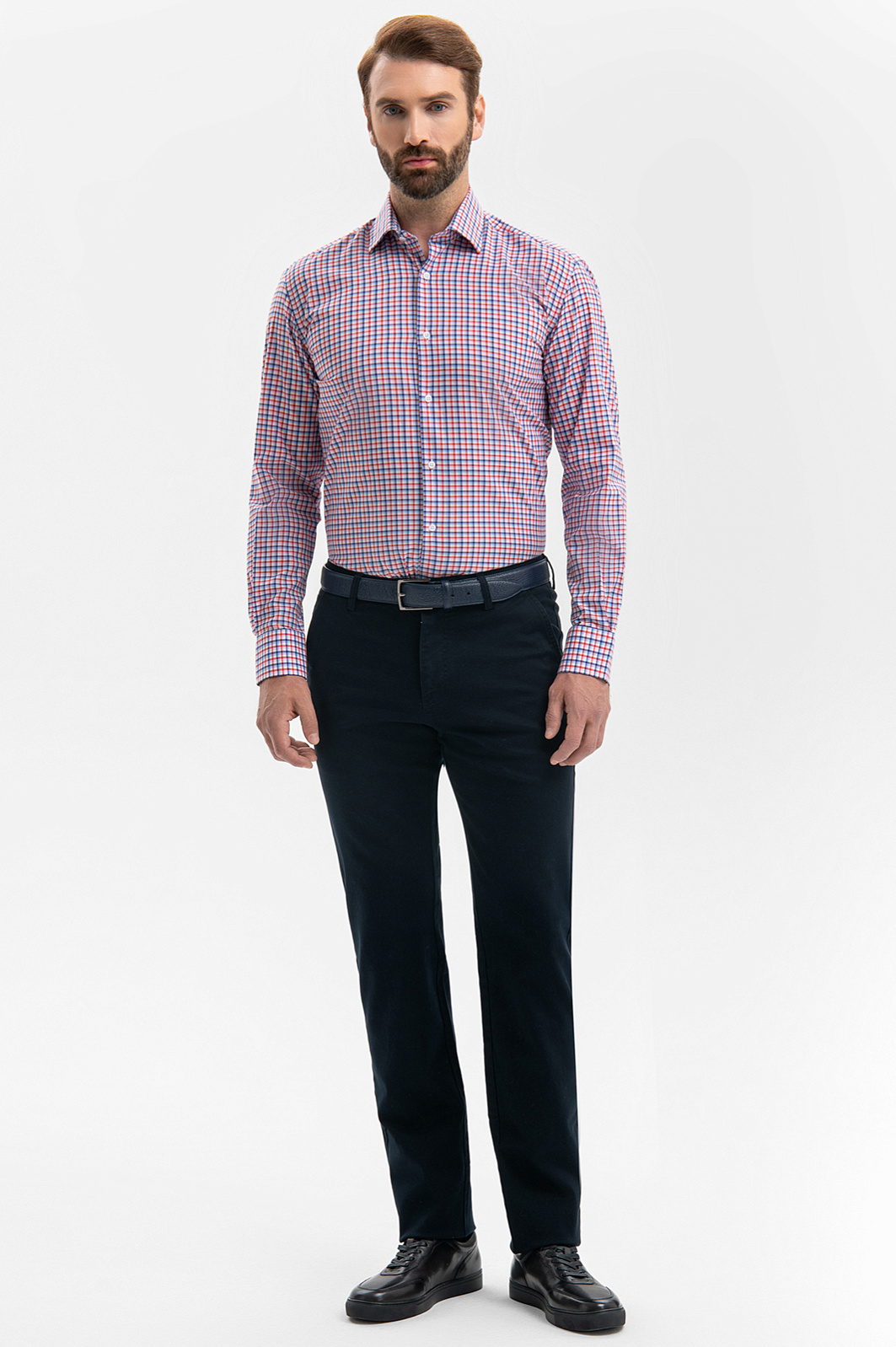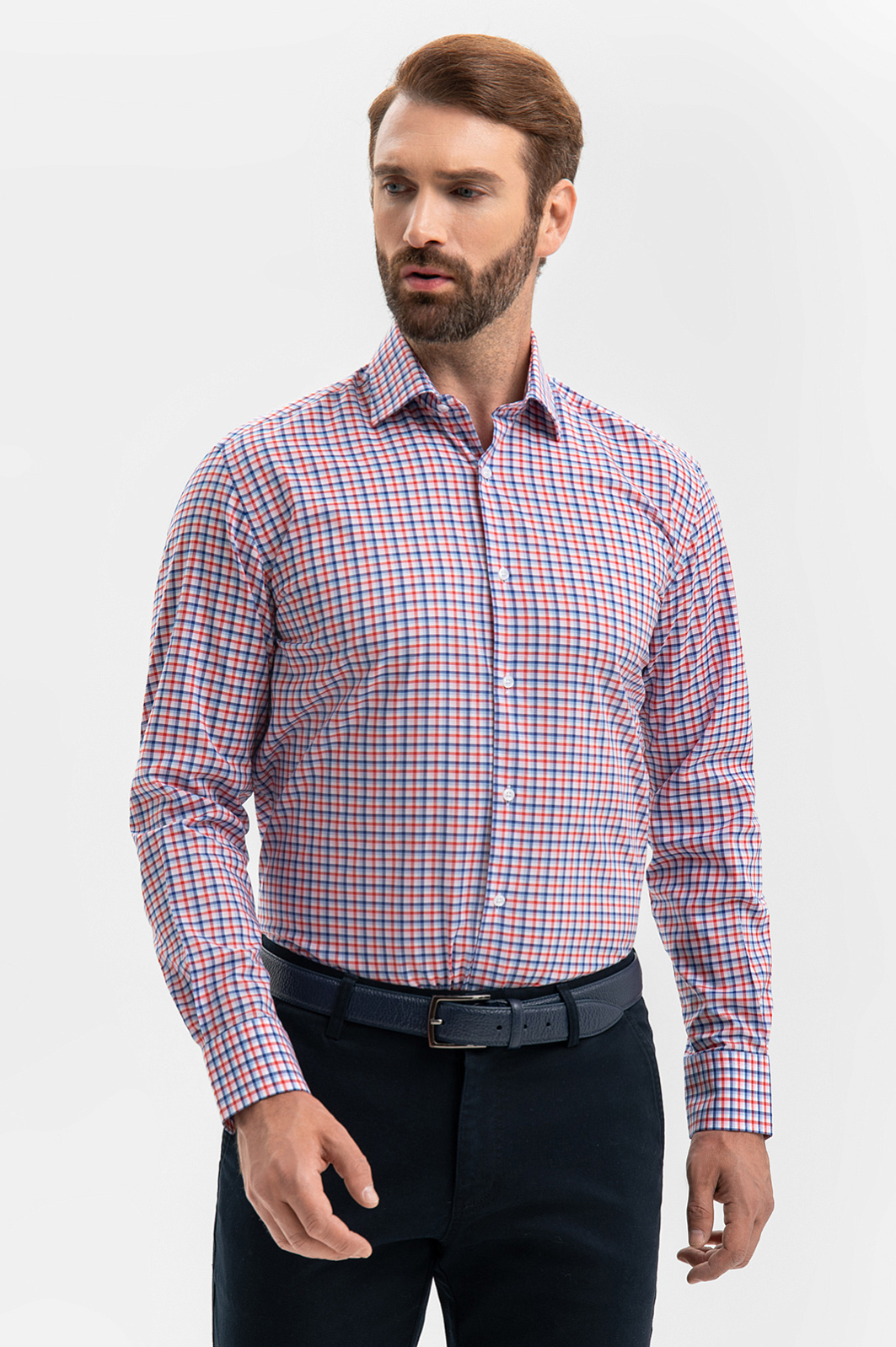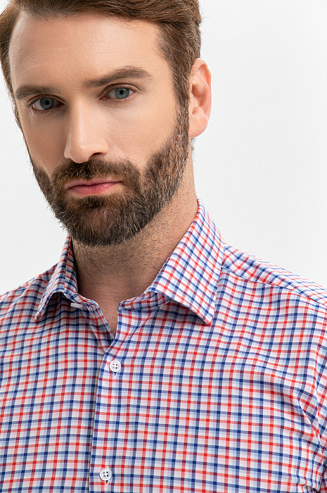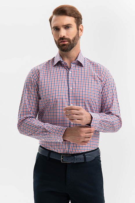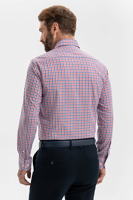 Неформальная хлопковая сорочка KANZLER создана для мужчин, которым и в офисе важно сохранять свободу и индивидуальность. Ее клетчатый принт задан синим, белым и красным цветами. Силуэт акцентирует внимание на мужественном развороте плеч и линии талии. Степень строгости образа можно варьировать, надевая с сорочкой классические или неофициальные брюки. Сорочка сделана из чистого хлопка — гипоаллергенного легкого дышащего материала, который сохраняет свежесть надолго. Носить ее легко и приятно. Параметры модели: рост 189, 102-80-99 Размер на модели: 40