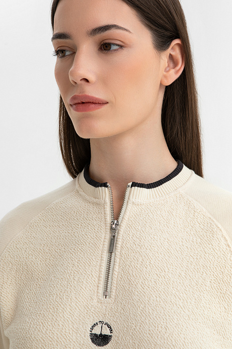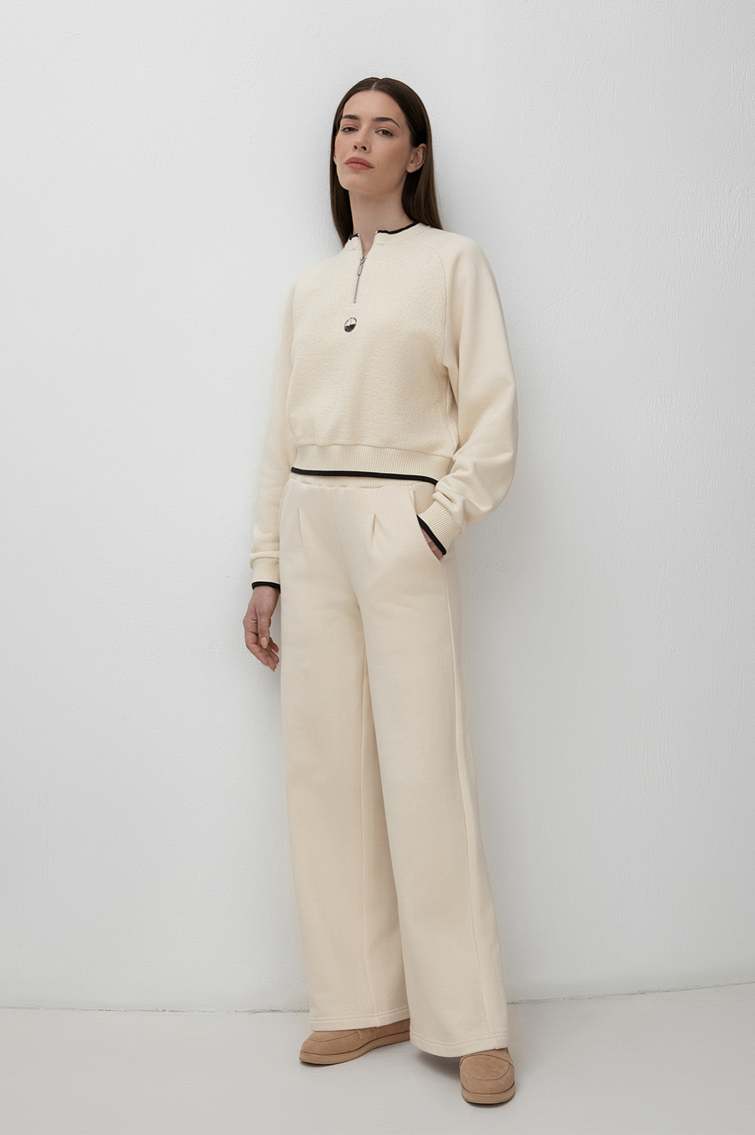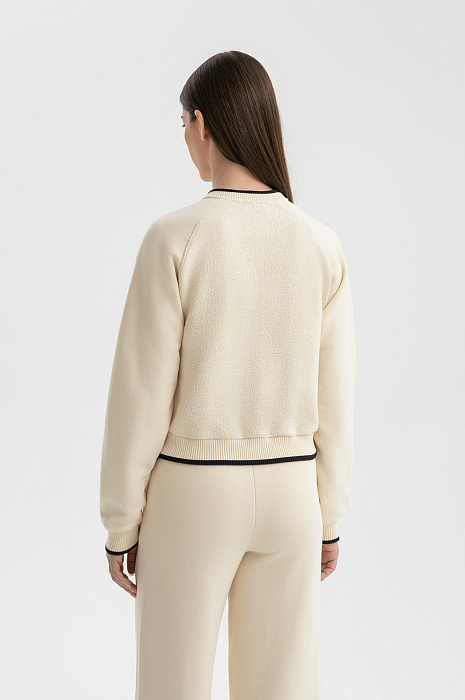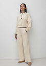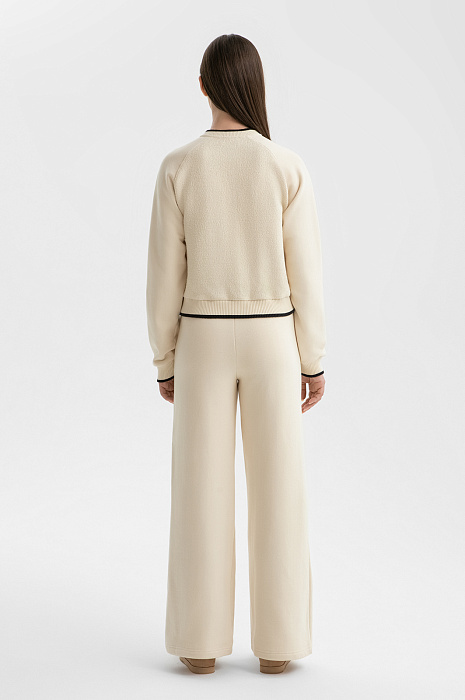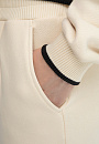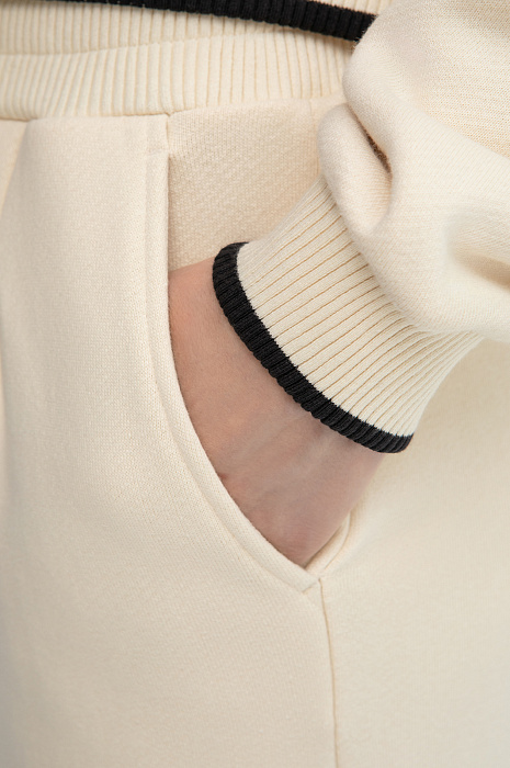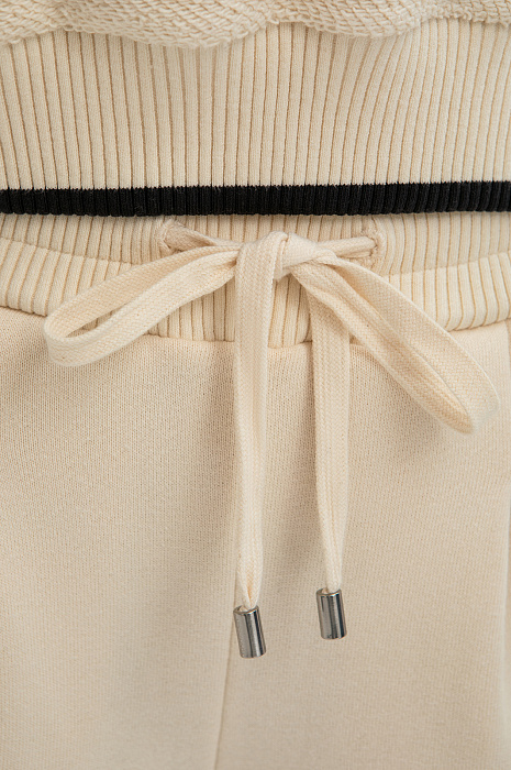 Костюм KANZLER из чистого хлопка нежного молочного оттенка — гармоничное сочетание рафинированной женственности, спортивной эстетики и бескомпромиссного комфорта. Нарядный вариант подходит как для расслабленного отдыха, так и для выхода в спортивный клуб или спа-салон. Воротник, манжеты и нижний край толстовки оформлены трикотажными резинками с акцентной чёрной линией, придающей ей графичность. Особое очарование создаёт контраст фактур: передняя часть и спинка выполнены из фактурного материала, рукава — из гладкой ткани. Свободные брюки на кулиске с лёгкими защипами мягко облегают тело, подчёркивая женственные контуры. Мягкий трикотаж сделан из 100-процентного гипоаллергенного хлопка. Натуральное воздухопроницаемое волокно «дышит» и сохраняет свежесть тела.
