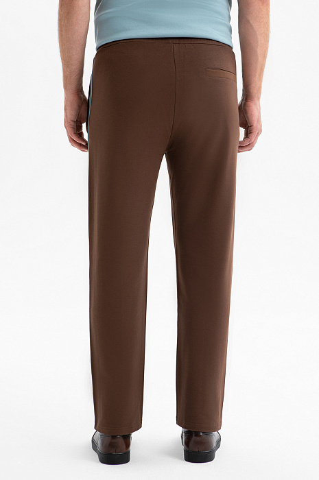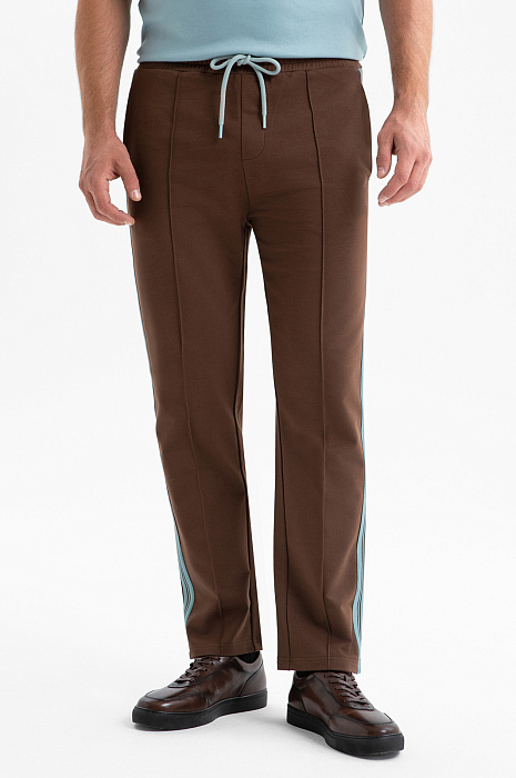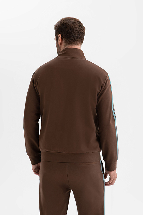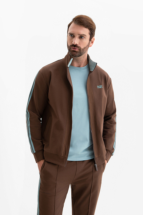 Коричневый спортивный костюм KANZLER из хлопка с голубыми деталями отлично подойдёт для прогулок, путешествий и активного отдыха, сочетаясь с кроссовками или кедами. Контрастные вставки придают комплекту свежесть, создавая современный лаконичный образ. Костюм составлен из толстовки на молнии, украшенной фирменной вышивкой на груди, и джоггеров, которые можно регулировать с помощью шнурка на поясе. Застроченные стрелки спереди и лампасы по бокам задают вертикальные линии, которые делают силуэт стройным и подтянутым. Натуральный гипоаллергенный хлопок, на основе которого произведён трикотаж, можно носить весь день. Он хорошо пропускает воздух и приятен к телу, а добавление синтетических волокон помогает ему держать форму и сохранять безупречный вид.