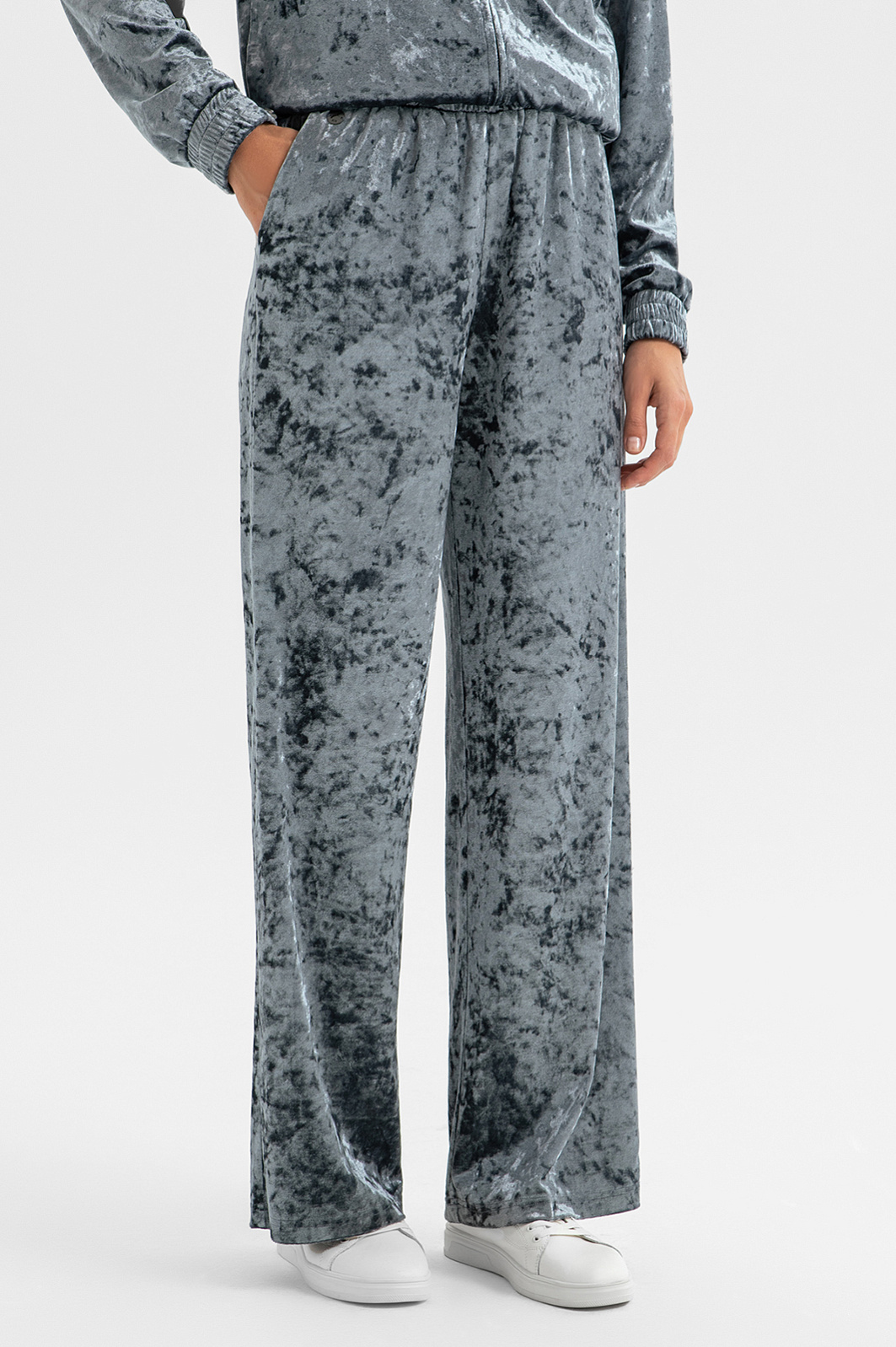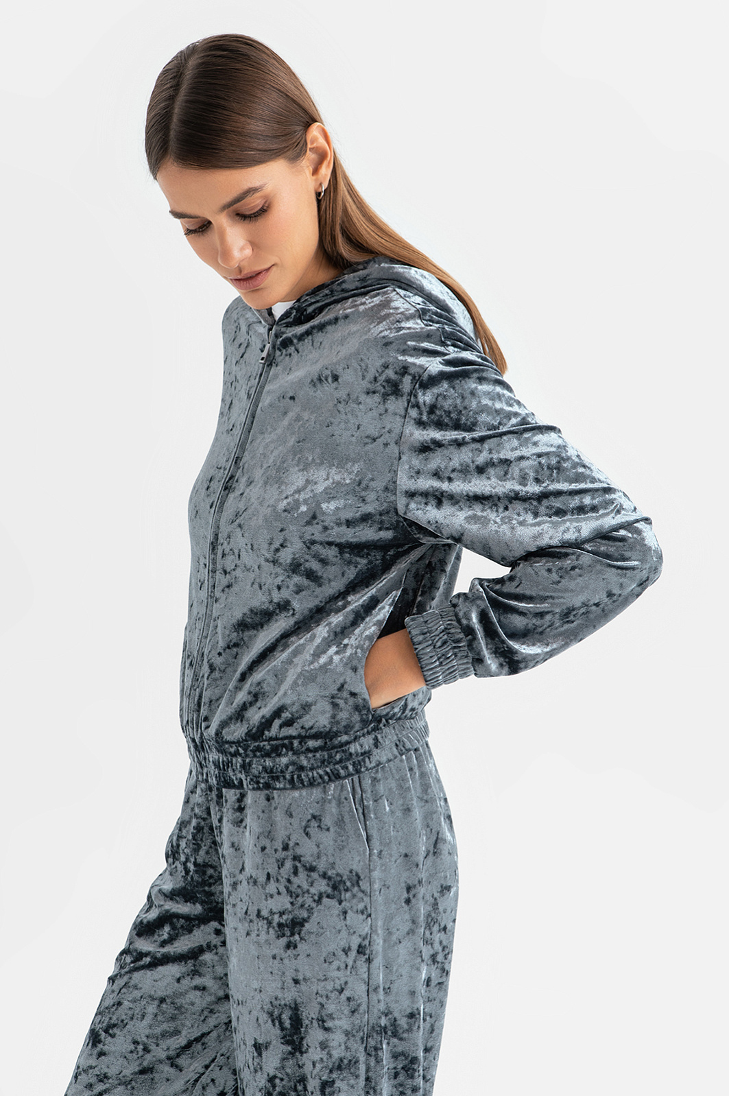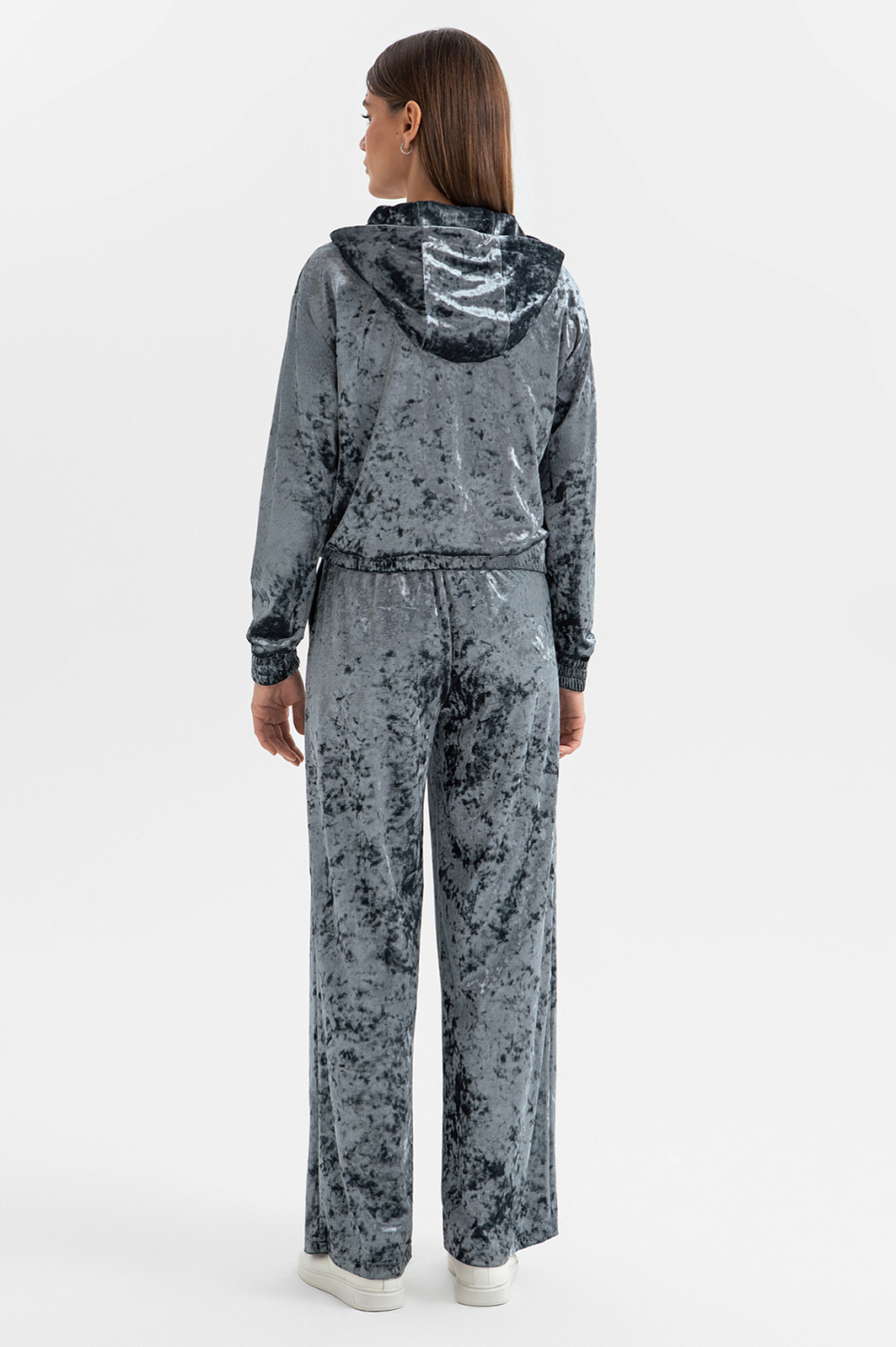 Женский костюм KANZLER из бархата — воплощение премиального комфорта. Толстовка с капюшоном и яркой мерцающей фактурой не только выглядит изысканно, но и практична для повседневной носки. Резинки на рукавах и вдоль края защитят от ветра в прохладные дни. Серые бархатные джоггеры дополняют образ, подчеркивая его утонченность. Эластичный пояс и свободный крой обеспечивают удобство и свободу движений. Комплект идеально подойдет для прогулок, отдыха за городом или даже вечеринки. Он легко трансформируется: носите толстовку и брюки вместе или по отдельности, комбинируя с другими элементами гардероба — футболками, свитшотами, джинсами.