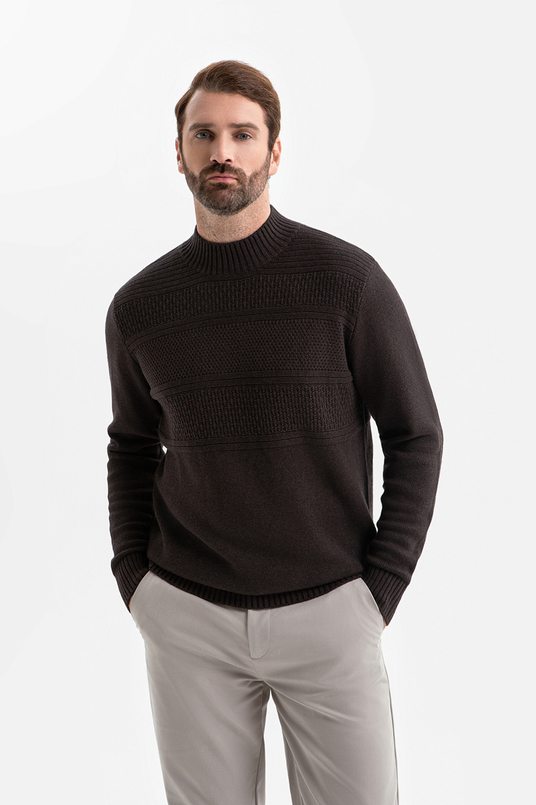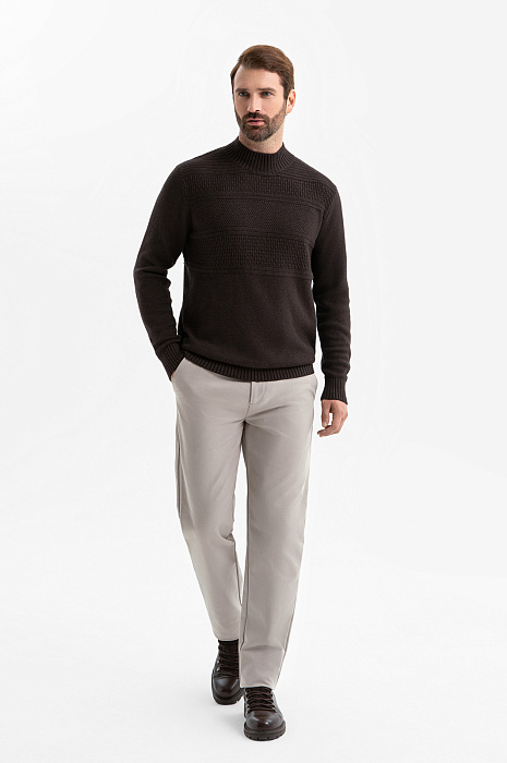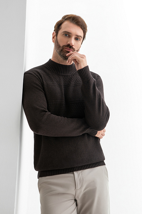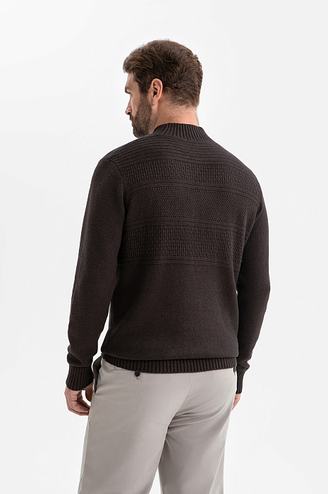 Свитер KANZLER из хлопка и кашемира глубокого коричневого оттенка окутывает уютом и спокойствием. Идеальный выбор офиса, прогулок и поездок в прохладный и холодный день. Неброский узор из полосок с разной текстурой придаёт вещи визуальную глубину и индивидуальность. Широкие трикотажные резинки на горловине, манжетах и по низу обеспечивают идеальную посадку, сохраняют форму и подчёркивают аккуратный силуэт свитера. Вязаное полотно создано из воздухопроницаемого гипоаллергенного хлопка (95%), который дарит мягкость, свежесть и комфорт. Добавление нежнейшего кашемира (5%) делает свитер особенно приятным к телу. Параметры модели: рост 189, 102-80-99 Размер на модели: M