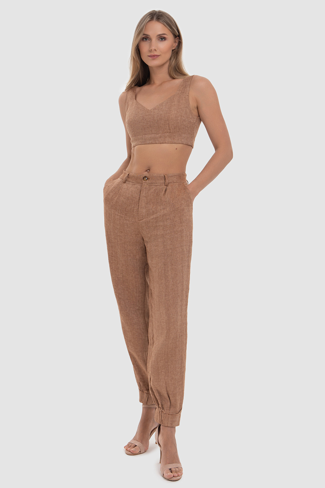 Укороченный топ KANZLER в благородном оттенке мокко с широкими бретелями сделает повседневный образ с парными брюками невероятно стильным и непринужденным. Для его создания использовали легкий материал из гладкой льняной пряжи, которая почти не ощущается на коже, сохраняя свежесть и комфорт даже в жаркую погоду. Пористые волокна придают ткани легкость, а приятный меланжевый узор и шероховатая фактура ткани добавляет изысканности. Треугольный вырез подчеркивает линию декольте, а прилегающий крой акцентирует фигуру. Наши стилисты советуют дополнить образ брюками из такого же материала. Комплект станет отличным дополнением вашего летнего гардероба - для прогулок по берегу моря во время отпуска или для создания многослойных сочетаний для города. Параметры модели: рост 180, 87-61-91 Размер на модели: S