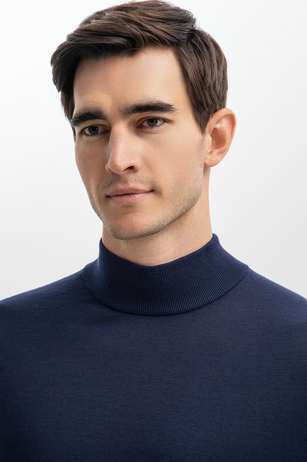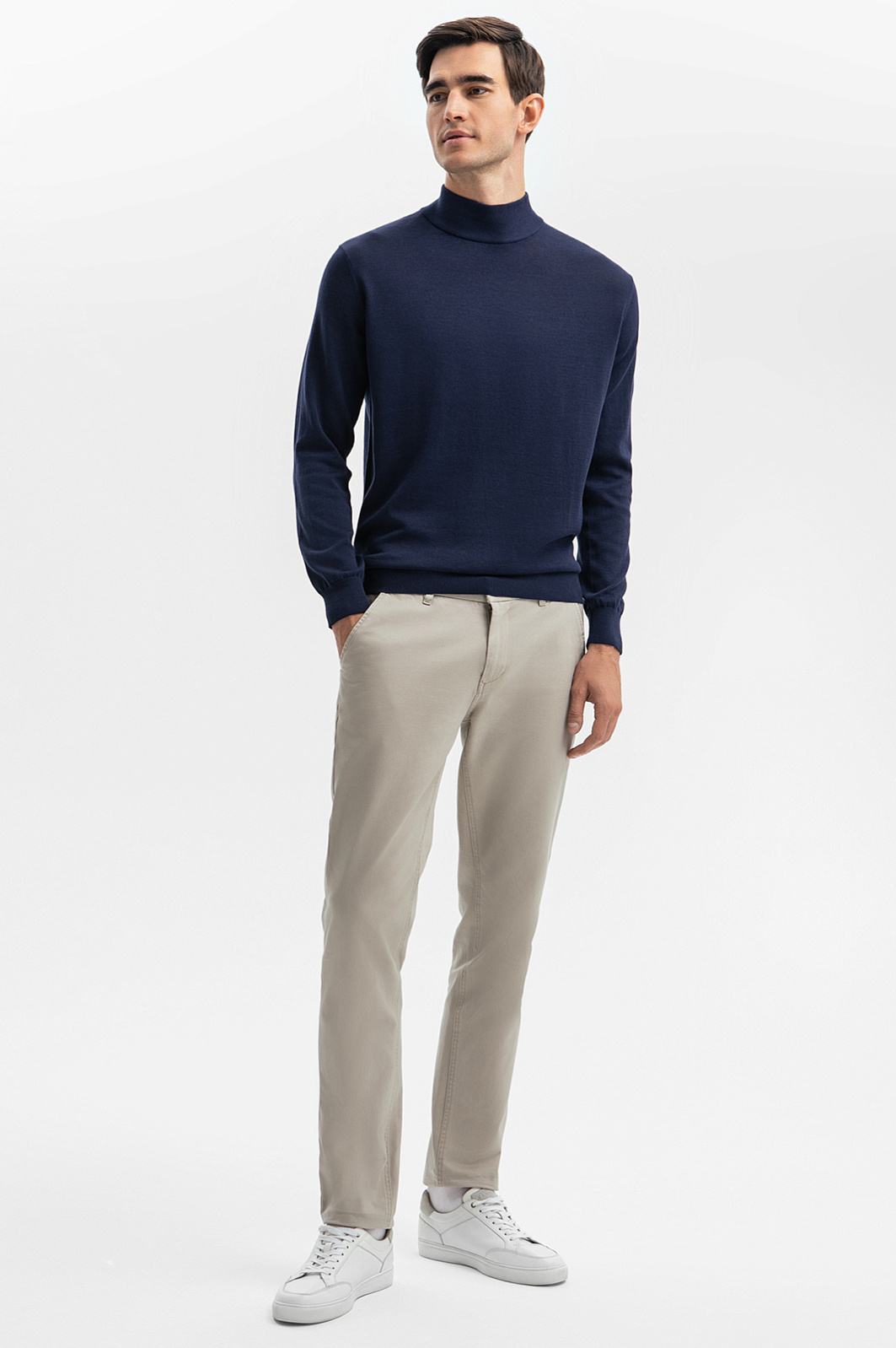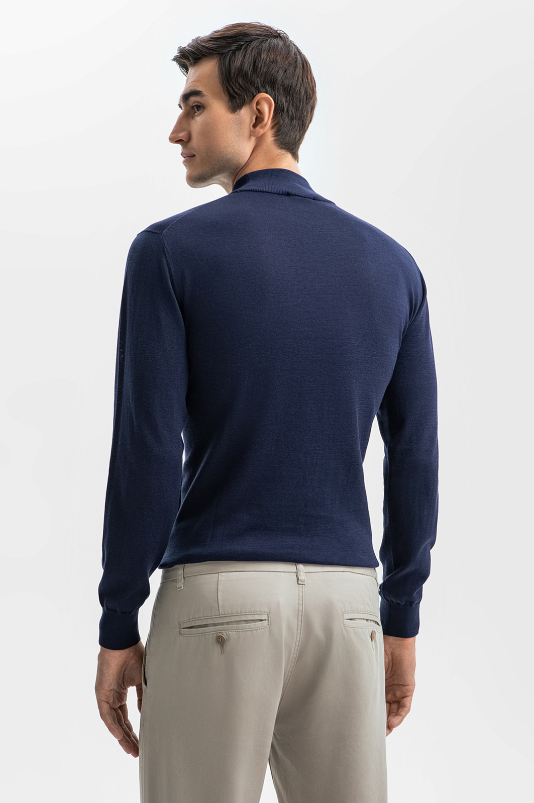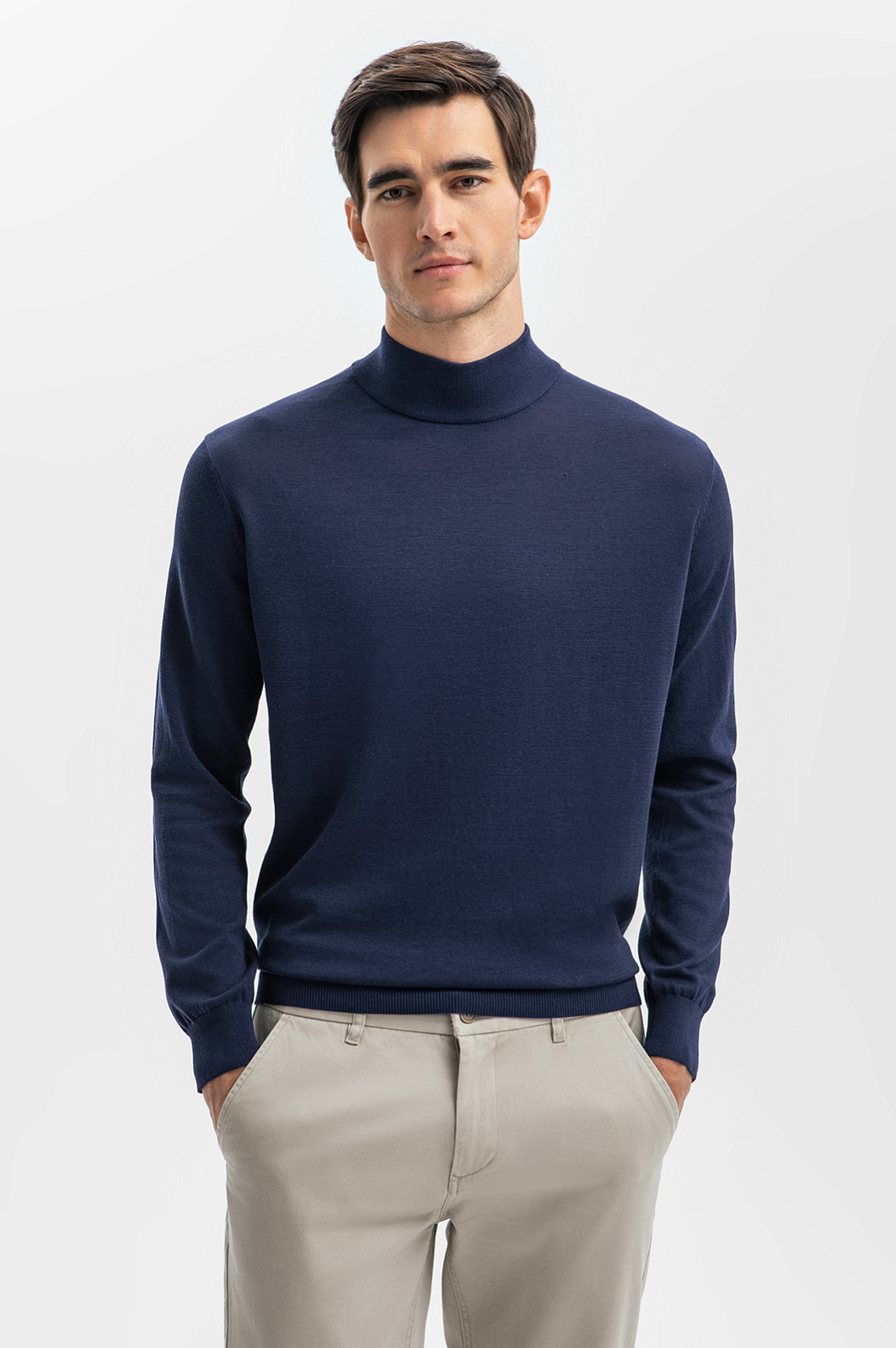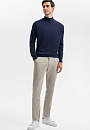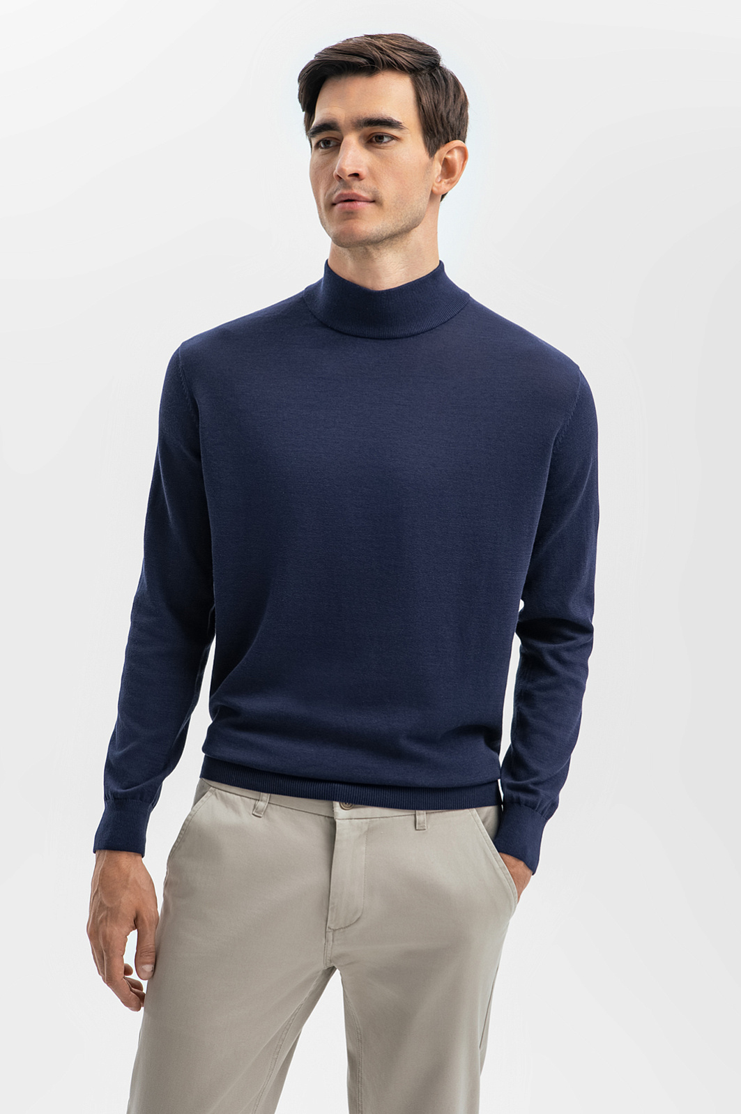 Для создания облегающей водолазки благородного синего оттенка дизайнеры использовали фактурный смесовый трикотаж на основе дышащего, согревающего хлопка, шелка и льна. Благодаря добавленным в пряжу шелковым нитям изделие не вытягивается, не пилингуется и долго сохраняет свой первоначальный вид. Особое внимание уделили высоте горловины: она не сдавливает шею, но при этом сохраняет тепло. Водолазка в синем оттенке станет идеальной основой для многослойных комплектов, добавляя вашему образу глубину и стильную изысканность. Предлагаем создать образ со светлыми брюками, темно-синим пиджаком и лоферами в тон. Параметры модели: рост 192, 101-76-97 Размер на модели: M