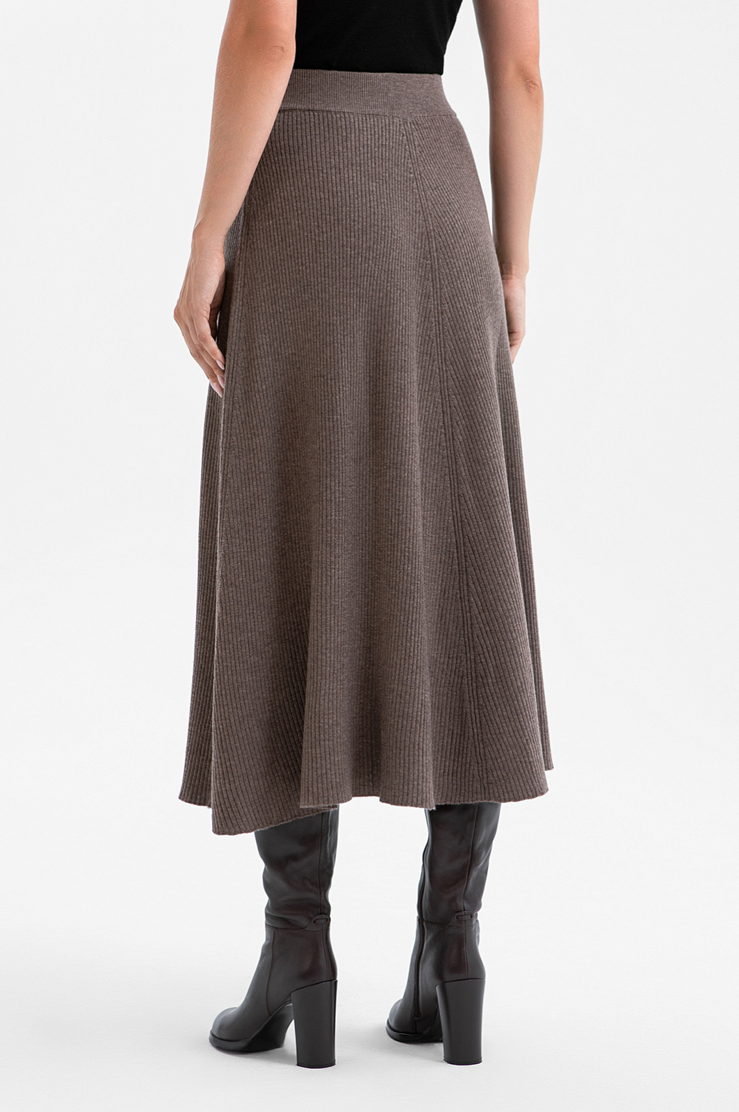 Миди-юбка KANZLER оттенка молочного шоколада из шерсти и кашемира — воплощение сдержанной элегантности и женственности. Универсальный крой позволяет сочетать юбку как с классическими блузами, так и с уютными оверсайз свитерами, а удобная длина подходит для любой ситуации — от деловой встречи до вечернего выхода. Модель отличается романтичным А-образным силуэтом: мягко облегая бёдра, юбка постепенно расширяется книзу, создавая ощущение движения и свободы. Широкий пояс подчёркивает талию и формирует гармоничные пропорции. Трикотаж в рубчик из благородной шерсти и нежного кашемира хорошо держит форму, оставаясь при этом мягким на ощупь и комфортным в носке.