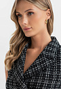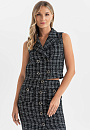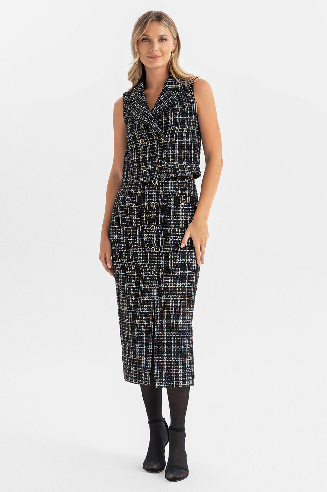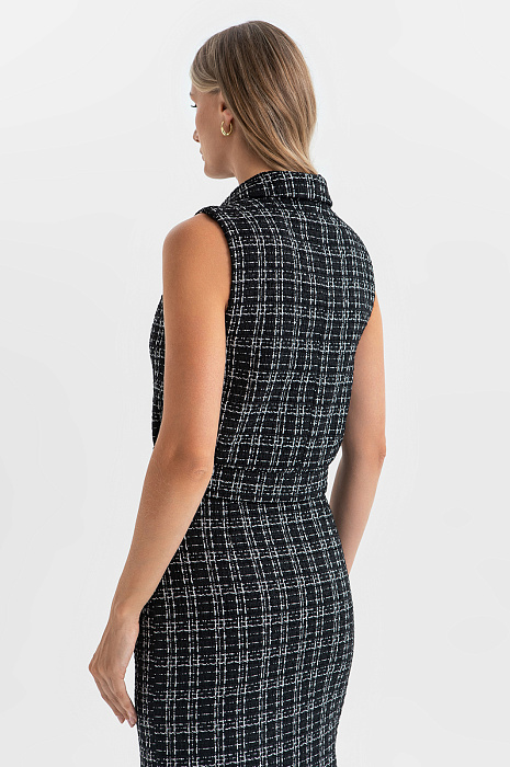 Воплощение элегантности и утонченности – жилет в клетку с отложным воротником и двойным рядом пуговиц. Строгость фасона разбавлена мягкой фактурой букле и деликатным узором. Прочный и долговечный высококачественный материал отлично держит форму. Пуговицы с золотистым обрамлением добавляют нотку роскоши в образ. Носите жилет в комплекте с юбкой-карандаш из такой же ткани или сочетайте с брюками или джинсами, создавая уникальные образы для офиса, деловых встреч или вечерних мероприятий. Параметры модели: рост 180, 87-61-91 Размер на модели: S