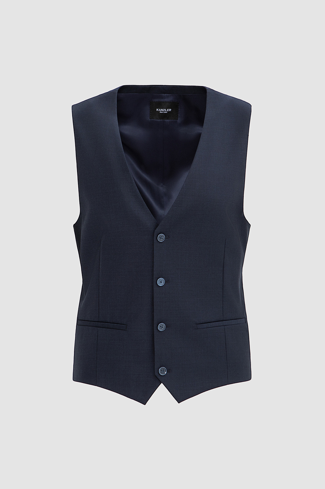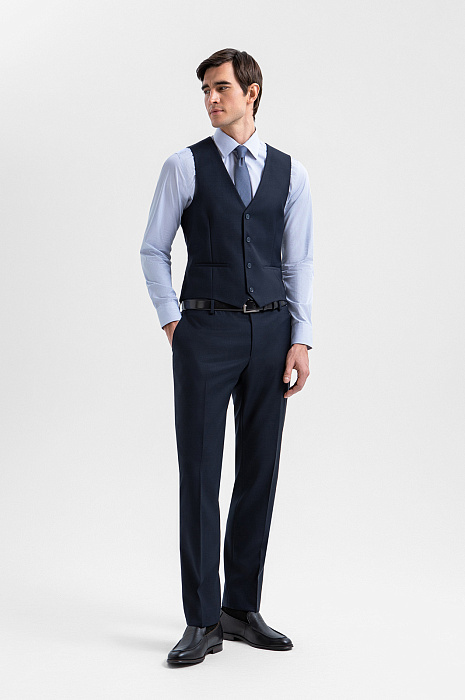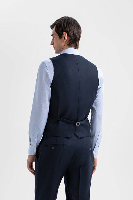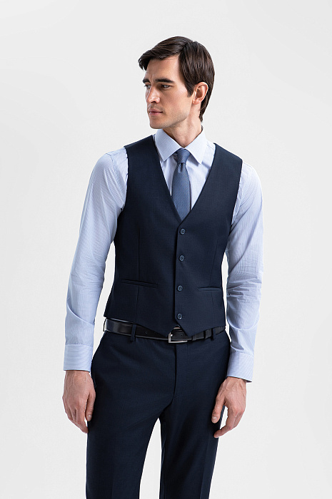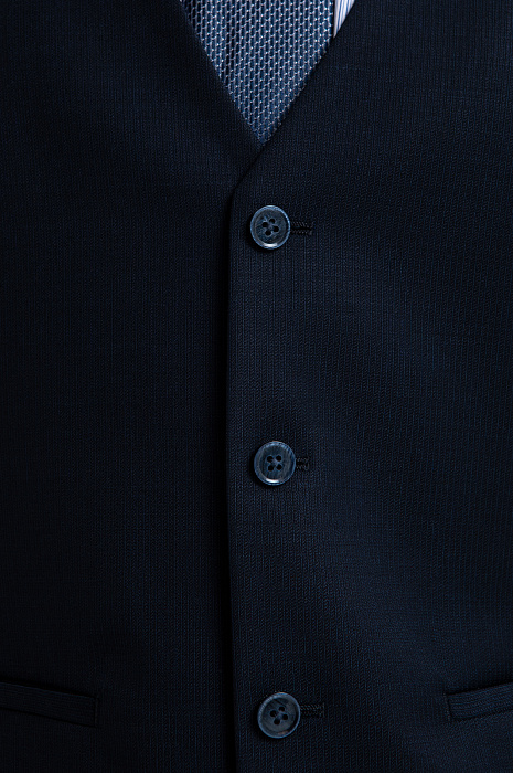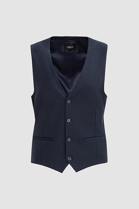 Темно-синий однобортный жилет KANZLER из шерсти мериноса обогащает образ и превращает обычный костюм в костюм-тройку. При этом достаточно изящен, чтобы в неформальной обстановке выступать самостоятельным верхом и не нуждаться в пиджаке. Слегка зауженный классический крой подчёркивает фигуру, не утяжеляя силуэт и сохраняя свободу движений. Слегка текстурная поверхность материала добавляет цвету глубину. Роскошная костюмная ткань создана из драгоценной шерсти мериноса Супер 120S. Тончайший ворс бережно сохраняет естественное тепло тела, обеспечивая комфорт как в прохладные, так и в тёплые дни.