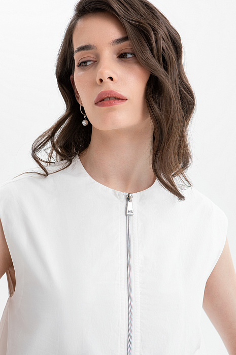 Белый жилет KANZLER без рукавов из 100-процентного хлопка — элегантная минималистичная вещь для тёплых дней, которая придаёт городским аутфитам современное звучание, свежесть и лёгкость. Присборенный низ делает образ более женственным. Прямоугольные декоративные клапаны подчёркивают лаконичную крой и геометрию, а молния и кнопки из белого металла — функциональный характер. Основная часть и подкладка модели выполнены из чистого хлопка. Его гипоаллергенные воздухопроницаемые волокна поддерживают ощущение свежести и берегут тело от перегревания в жаркие дни.